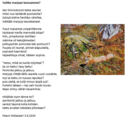 Yhdistys teki taideretken Raaheen 23.9.2025, jossa kohteena oli monitaiteellisen jäsenemme Paavo Niskasaaren Sadonkorjuun aikaa -näyttelyn avajaiset. Taidenäyttelyn anti oli värikylläistä ja koskettavaa. Taulujen tarinaa ja tunnelmaa Paavo voi esille myös niihin liittyvien runojen kautta.